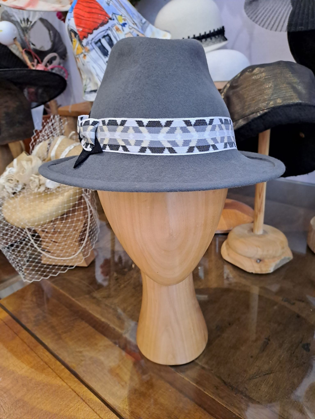 Borsalino en feutre de laine mérinos gris, galon jacquard et cabochon